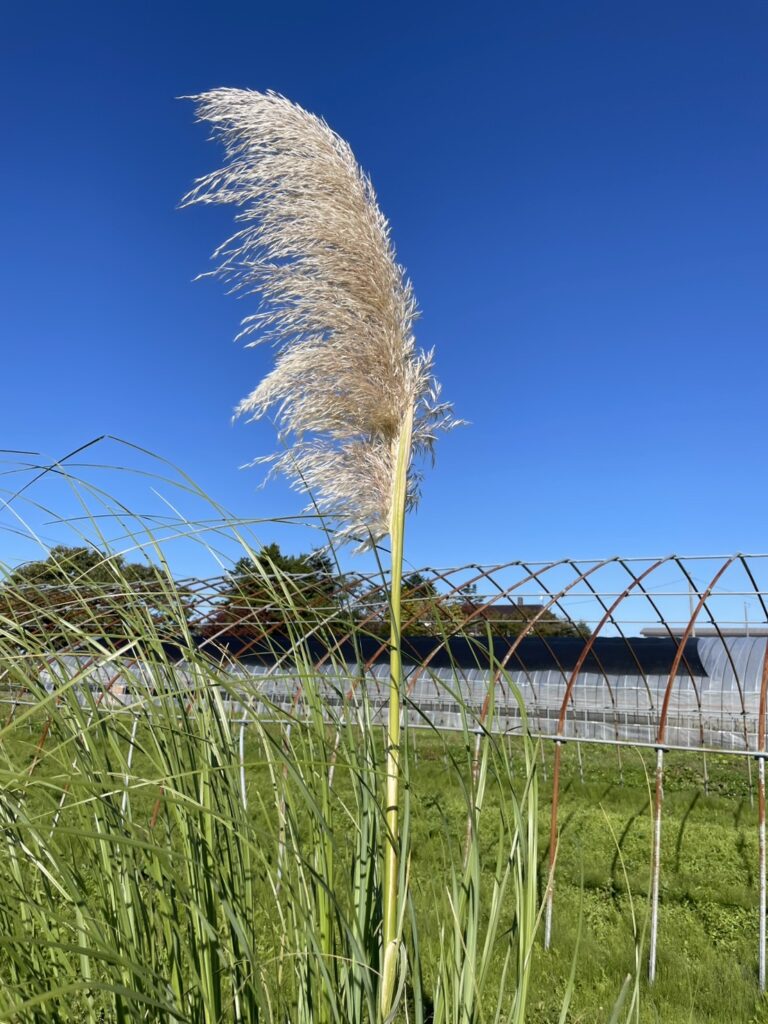 写真はパンパスグラスと言う温暖な地域で多く見られるすすきに似た植物ですが、仲間と九州に視察に行き、北海道で越冬するかわからない中で試験栽培をしています。