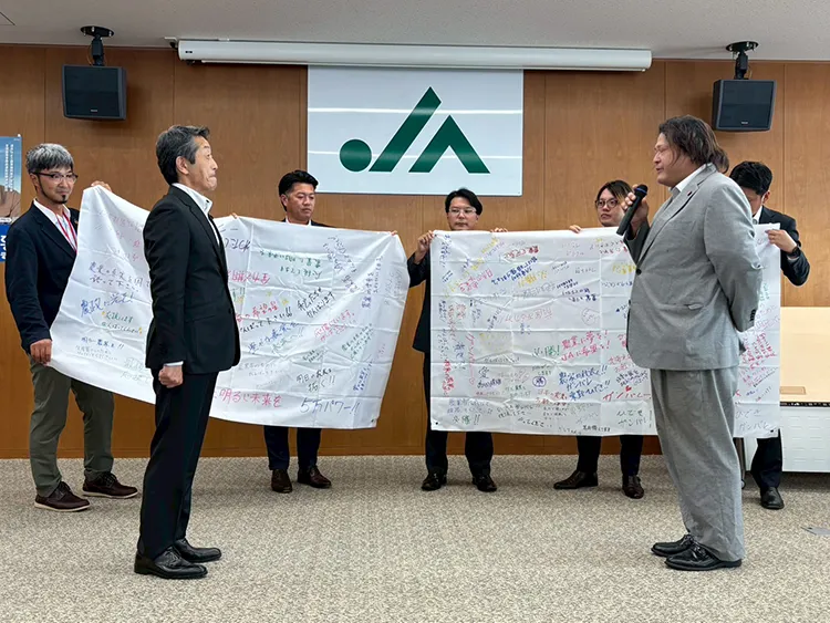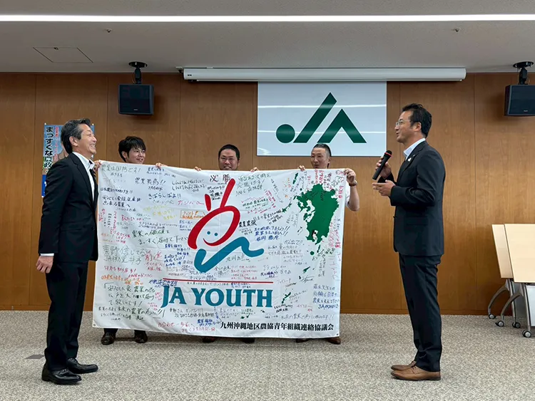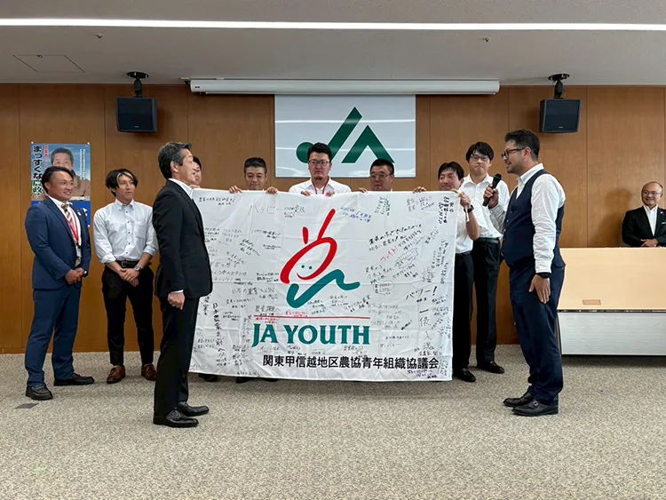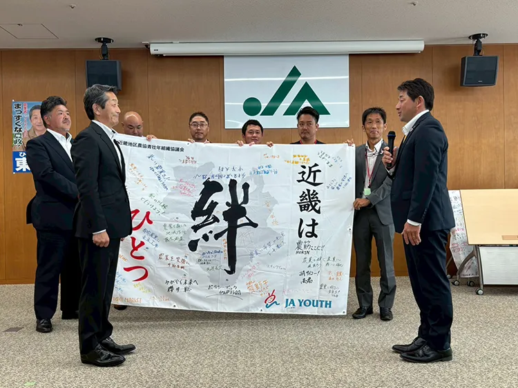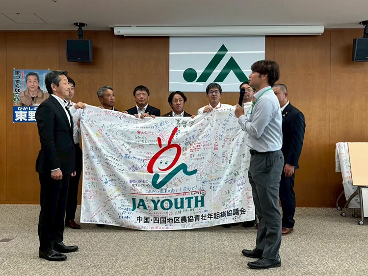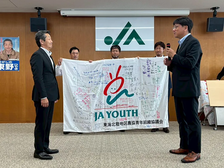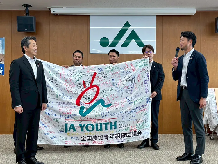 9月30日(火)、全国6ブロックの青年大会や研修会・JA全国青年大会および7月の遊説の際に、全国の盟友から激励のメッセージを寄せ書きいただいたJA YOUTH旗を、東野ひでき参議院議員へお渡ししました。